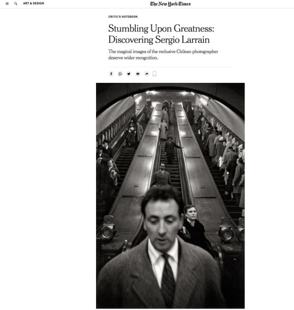 A notoriously reclusive artist, Sergio Larrain has nonetheless become a touchstone for those who have come to know and love his work, including authors Roberto Bolaño and Julio Cortázar. Larrain's experimental process yielded images that transformed the fixed nature of the medium. His images have left generations of viewers in awe of the simultaneous serenity and spontaneity that a camera can capture-when placed, that is, in the hands of an artist with such rare meditative passion. "A good image is born from a state of grace," the artist once explained.